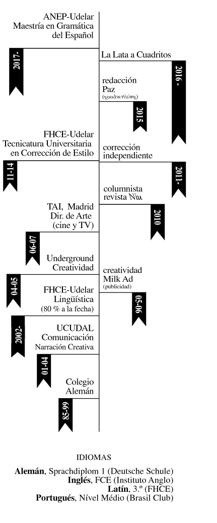 Pati GonzálezRedacción, edición, corrección Creé La Lata a Cuadritos después de trabajar en distintas áreas (publicidad, audiovisual, etc.), tramando un camino guiado por mi amor hacia el lenguaje. Si bien mi título de grado es en Comunicación (Ucudal), en paralelo a esa carrera, siempre que pude estudié materias de Lingüística. Cuando terminé la tecnicatura en Corrección (Udelar), di comienzo a este proyecto; curiosamente, primero redactando, luego editando y corrigiendo.